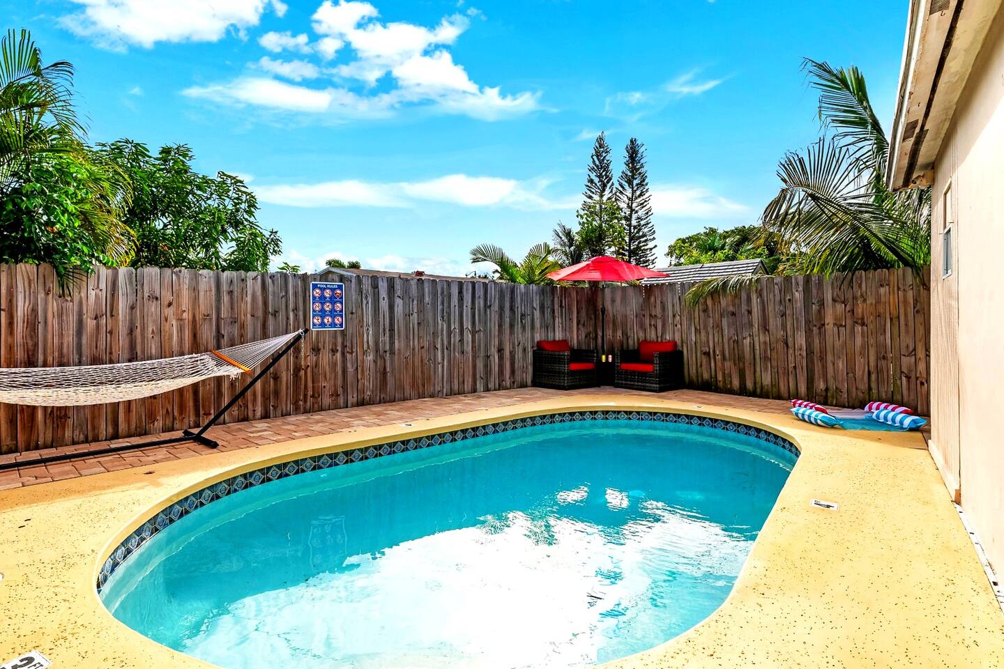 Check-In/Check-Out: Our standard check-in time is 4:00 PM and check-out is at 11:00 AM. Please let us know in advance if you require any special arrangements, and we will do our best to accommodate your needs. No Smoking: This includes, but not limited to, cigarettes, any type of vaping and cigars within the property. We kindly ask that you use the designated outdoor area for smoking. A $500 fee will be charged if any kind of smoking in the property occurs. Quiet Hours: In consideration of the neighbors and fellow guests, we observe quiet hours between 10:00 PM and 8:00 AM. Please our entertainment amenities responsibly during these hours. No Parties: As previously mentioned, our property enforces a strict no-party policy to ensure a serene and peaceful atmosphere for all guests. Pool - the pool is cleaned once a week on either Monday or Tuesday in the morning. Bugs- We like to take prevention methods in any area we can, that includes keeping the Florida bugs out of the comfortable living spaces. We pay a monthly service for a local and reputable pest control company (Petri Pest Control). If you do happen to see any bugs inside the property, alive or dead, please take a picture and send it to us and we will send out someone from Petri Pest Control. Lawn Maintenance - Done twice a month Local Attractions: Our retreat is conveniently, centrally located around some great areas, while Pompano itself has many things to do for everyone. Don't hesitate to ask us for recommendations on local attractions, dining, and activities to help make the most out of your stay. We look forward to hosting you and providing you with a memorable experience here at our Pompano Beach Retreat!