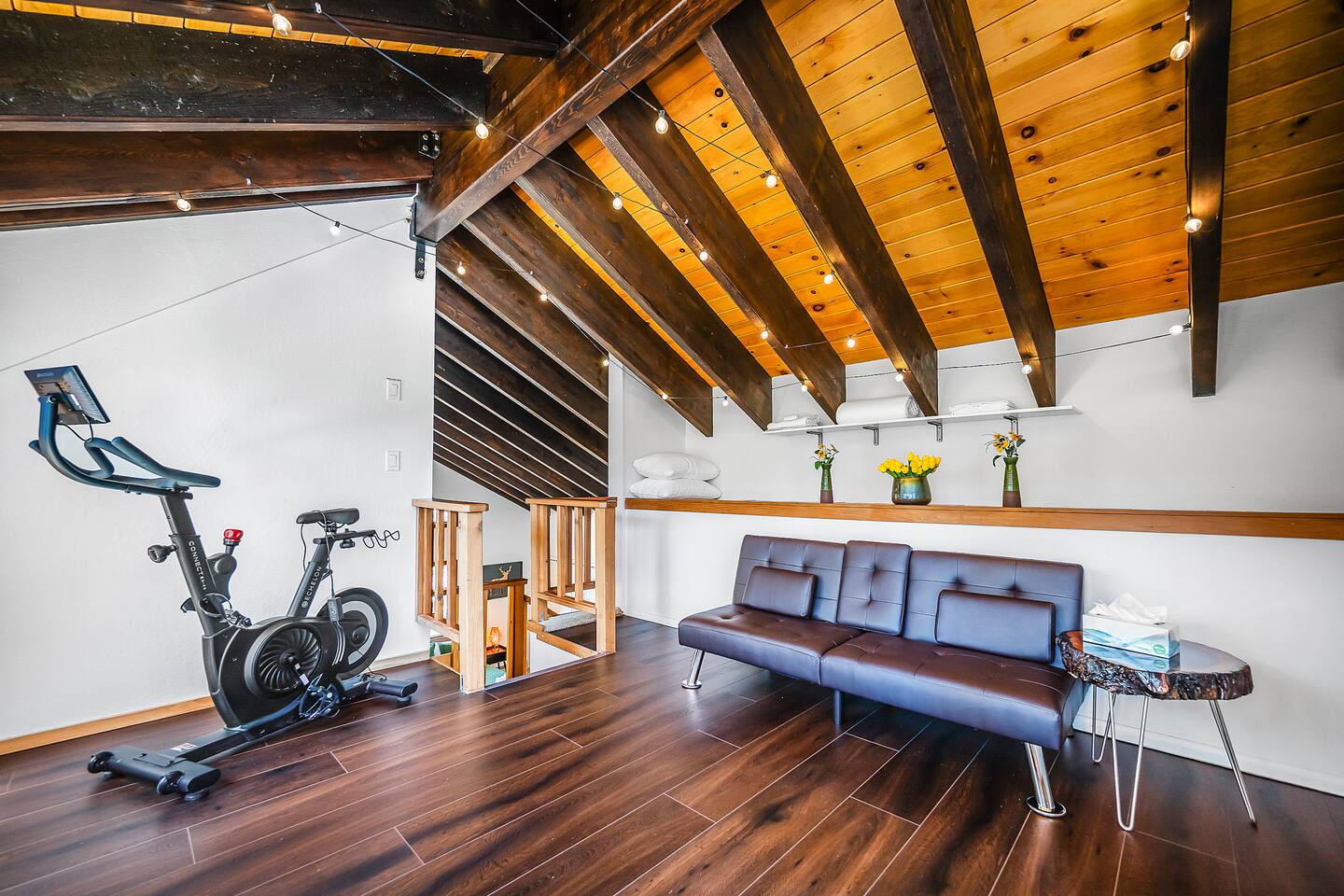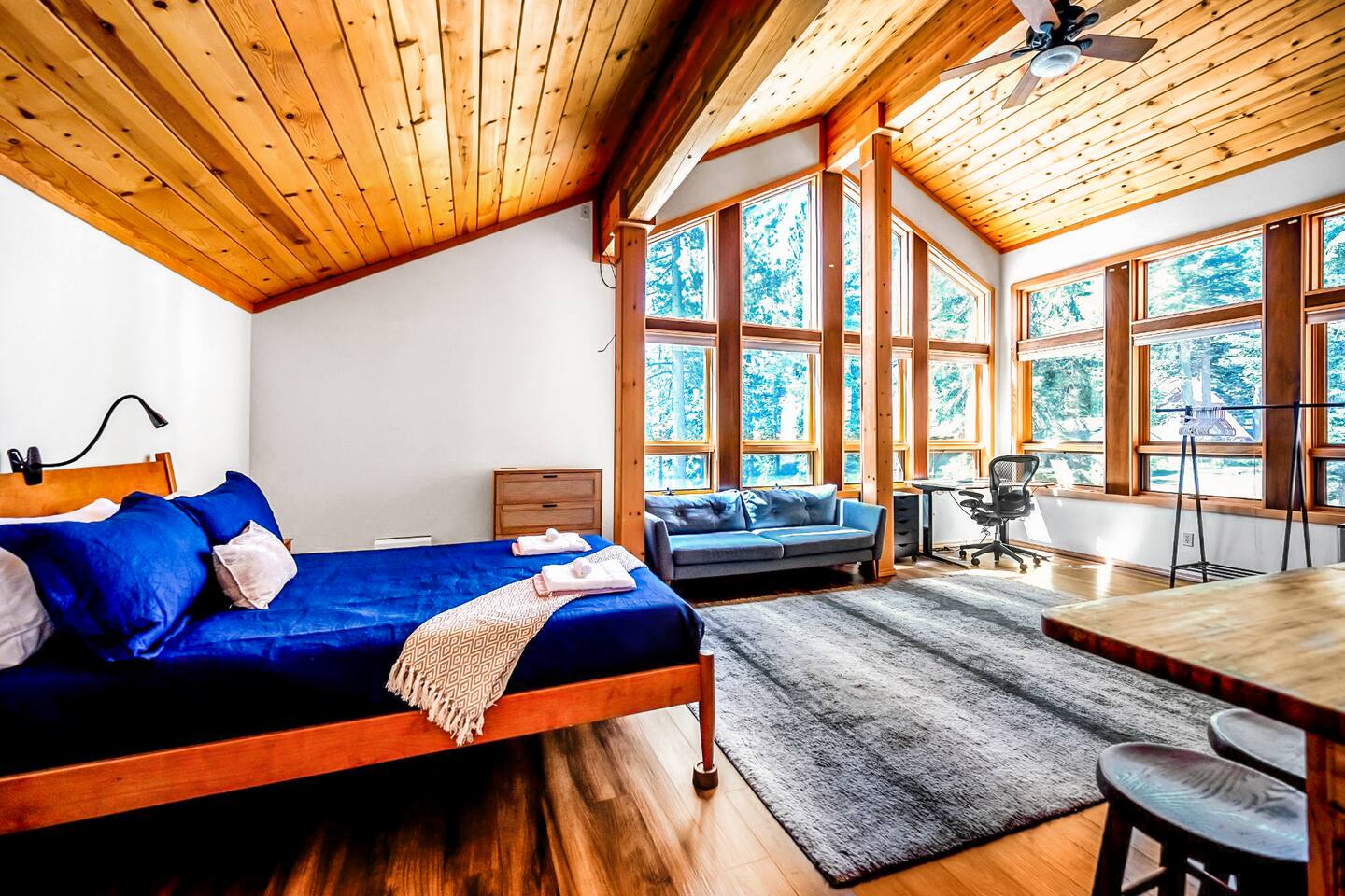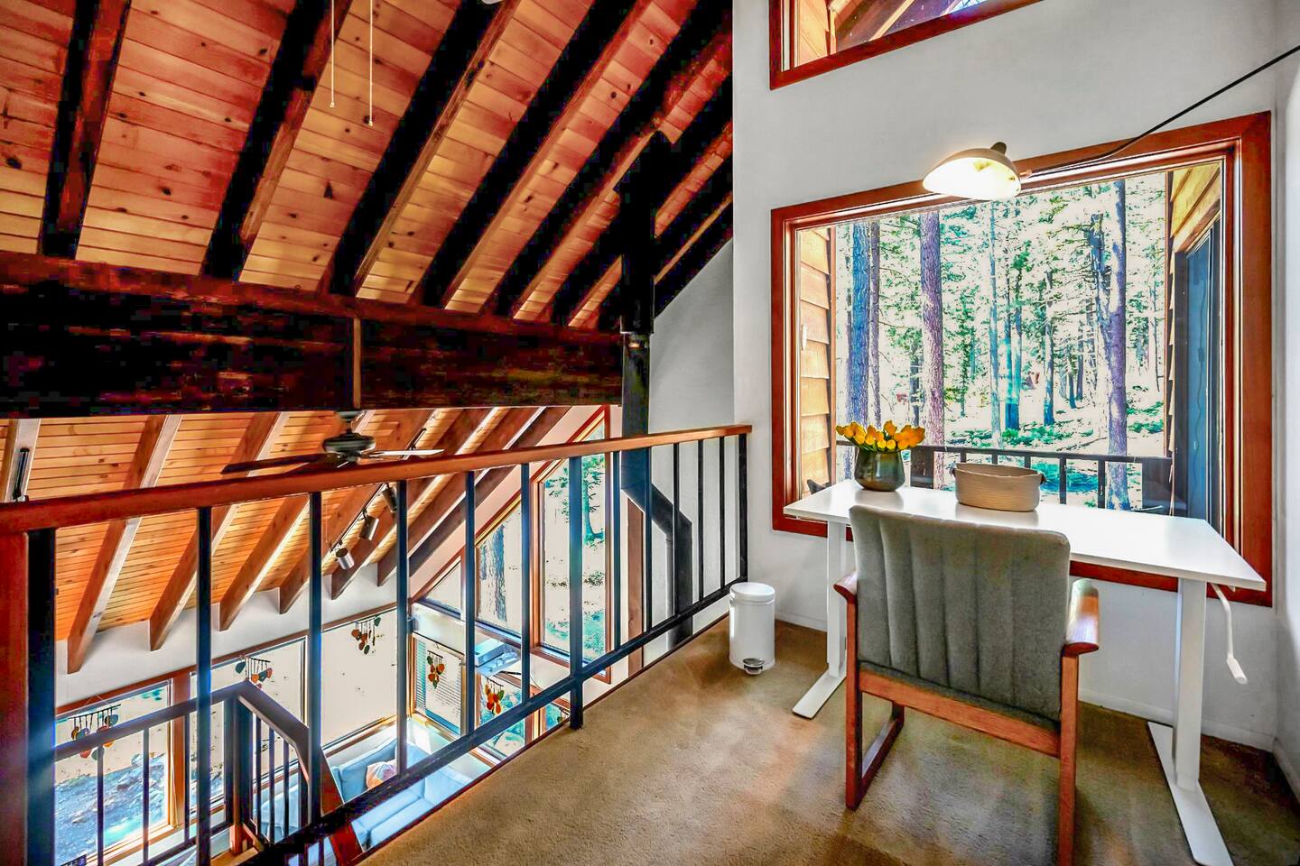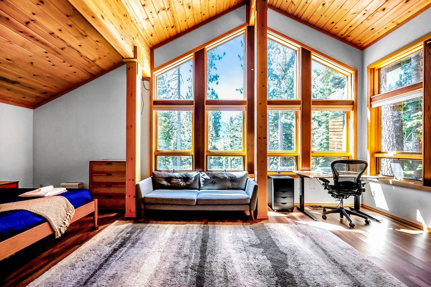 Step into this spacious, light‑filled multi‑level chalet designed for comfort and connection. On the main level, enjoy a high‑end kitchen with island, an indoor dining area, and access to two decks—one with string‑light dining and another with a BBQ grill. A full bath and laundry are also on this level. Upstairs, the primary suite offers a queen bed with a private ensuite, while a second bedroom has another queen bed and workspace. Above that, a loft fitness room features a Peloton, yoga mats, TV, and a hidden twin sofa bed. Down from the main level, unwind in the projector lounge with surround sound, an L‑shaped couch, and an office area with another twin sofa bed, plus access to a deck with patio seating. Outside via a short stairway, a private studio awaits with a queen bed, kitchenette, full bath, and workspace—perfect for extra privacy. Natural wood tones, forest views, and thoughtful details make every level feel like home. 🌟 Amenities & Features ✅ 3 queen bedrooms + 2 twin pull‑out sofa beds (loft & office) ✅ 3 full bathrooms (primary ensuite, main level, and in studio) ✅ Main kitchen with high‑end appliances + additional kitchenette in studio ✅ Multiple decks: outdoor dining with string lights, BBQ deck, and private balcony off primary and studio ✅ Fitness/yoga loft with Peloton bike, mats, and TV ✅ Large projector screen with surround sound & L‑shaped couch ✅ Dedicated office & extra workspaces throughout ✅ Laundry on main level ✅ Garage, driveway, and street parking available 📍 Location Highlights ☀️ 10 minutes to Lake Tahoe 🎿 At the base of Alpine Meadows (Ward Peak side) 🌲 Surrounded by hiking trails, forest wildlife, and peaceful views 🛍️ 15 minutes to Tahoe City shops & restaurants 🏷️ House Rules 🚭 No smoking inside or outside 🐾 No pets (allergy‑friendly home) 🎉 No parties or events—quiet neighborhood 👥 Maximum of 8 guests 🔇 Please respect quiet hours after 9 PM