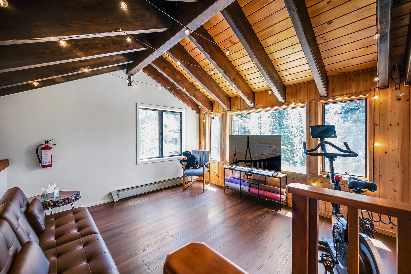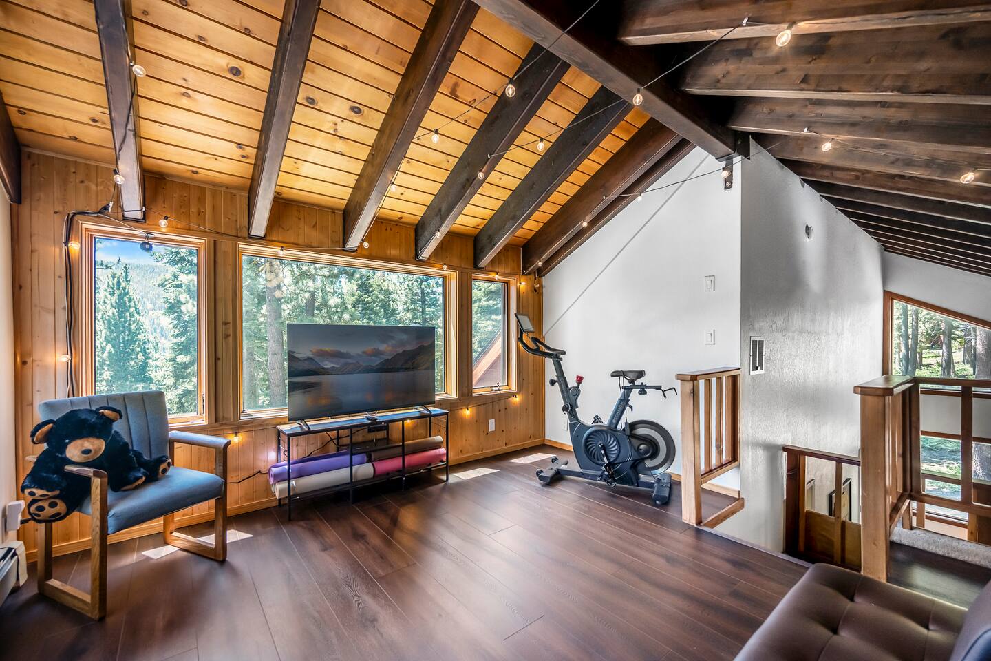 Wake to mountain views in this luxury chalet minutes from Lake Tahoe. Lounge on the forest‑view deck or by the modern fireplace. Host movie nights on the large projector screen, keep active in the private fitness room, and enjoy bright, open living spaces. A perfect blend of adventure and serenity in a quiet Tahoe setting.