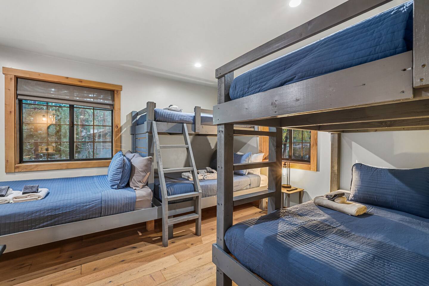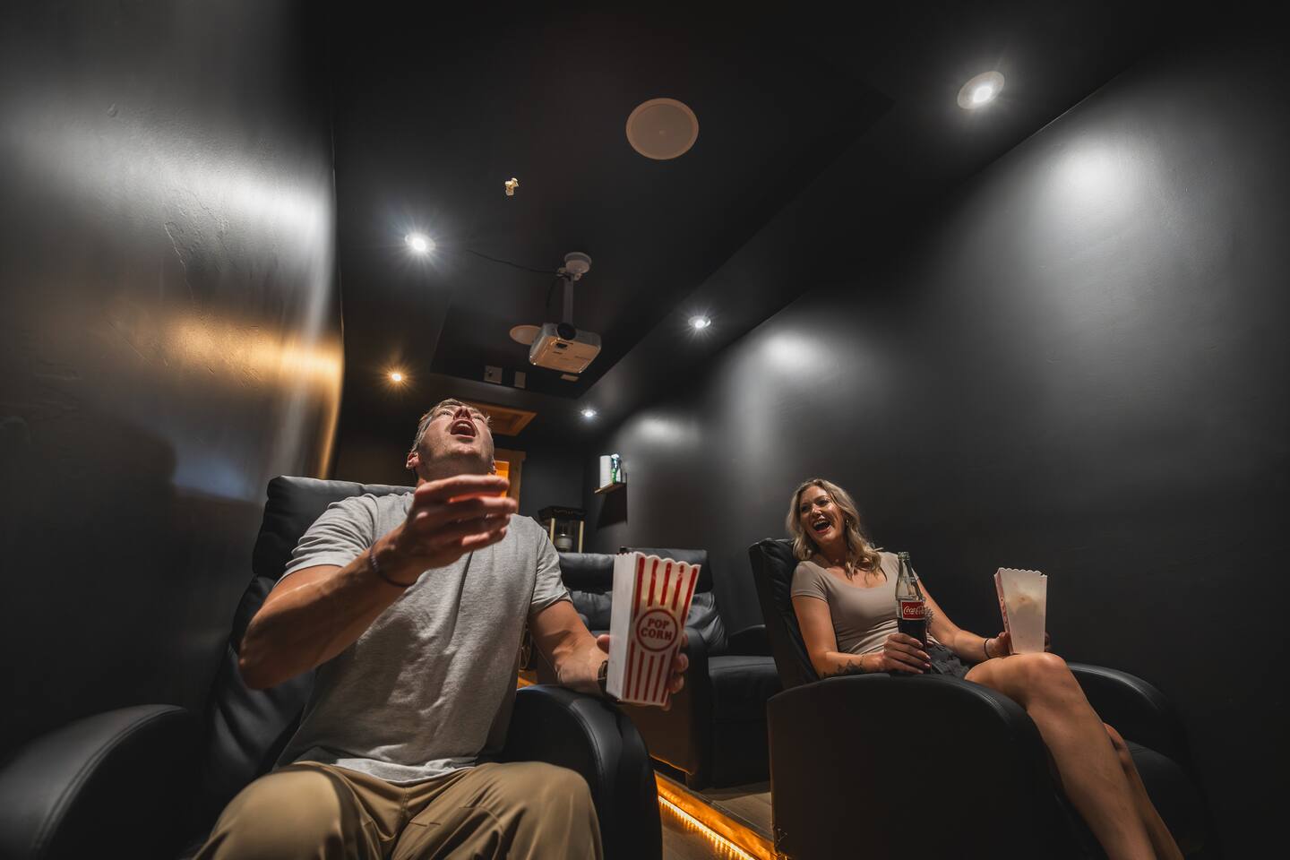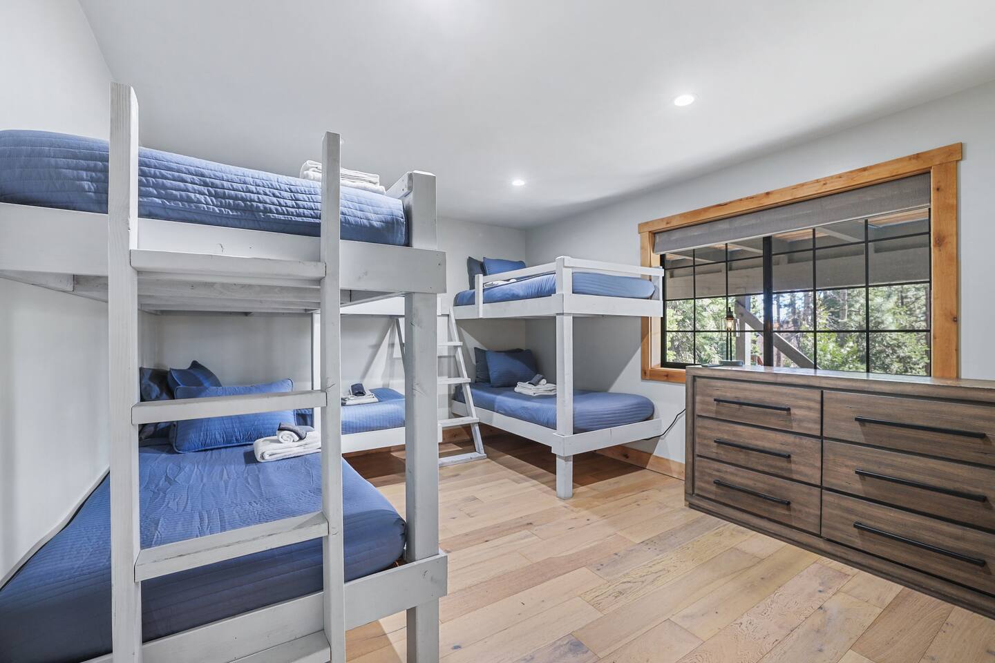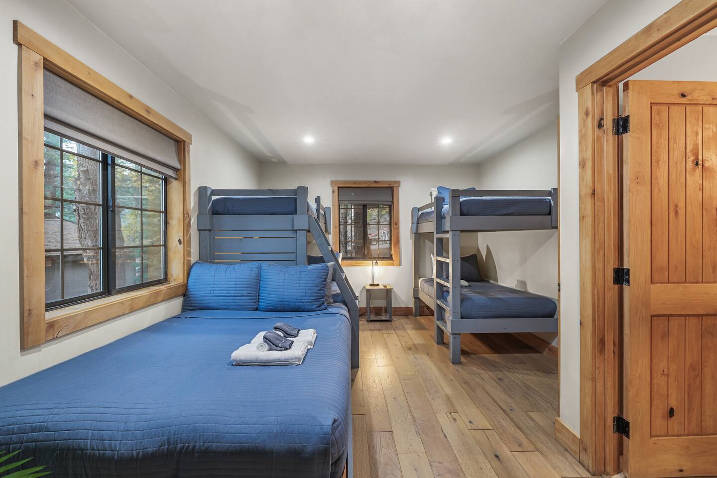 This five-bed, seven-bath, 2,735 sq ft home is designed for large groups and families (up to 18 guests). Bedroom 1: King Bed Bedroom 2: King Bed Bedroom 3: King Bed Bedroom 4: 2 Full Beds + 3 Twin Beds (2 bunks) Bedroom 5: 6 Twin Beds (3 bunks) The open-concept living area features a stone fireplace and large windows overlooking the trees. Gather around the chef’s kitchen island or step onto the spacious deck for BBQs and sunsets. The enclosed movie theater has seven recliners, a projector, and a popcorn machine — a true cinema experience at home.