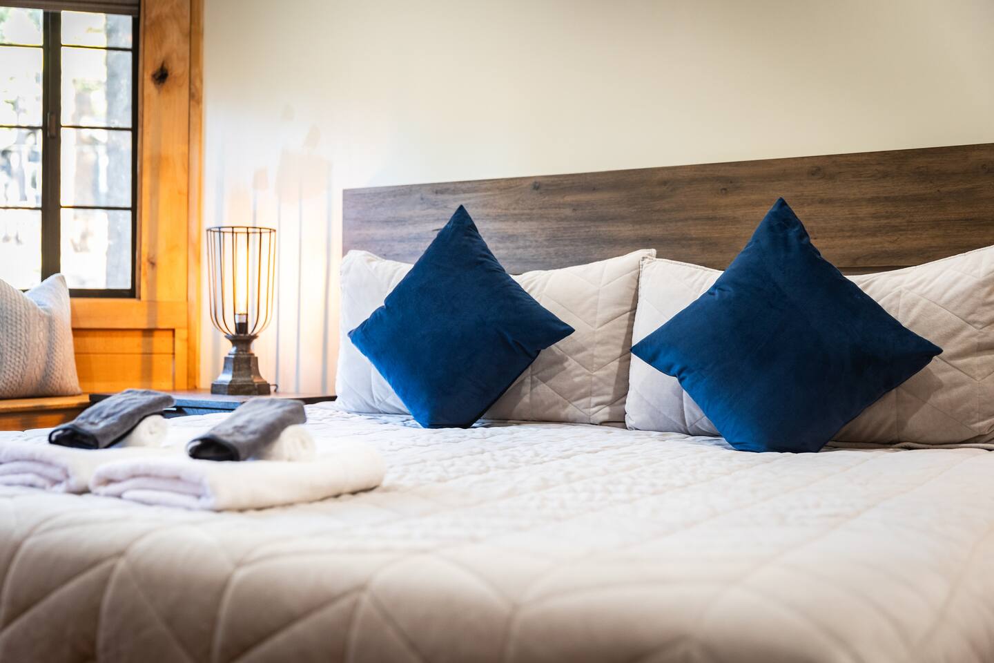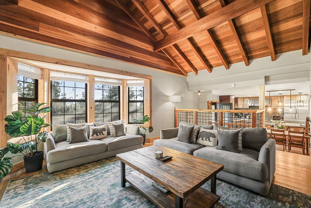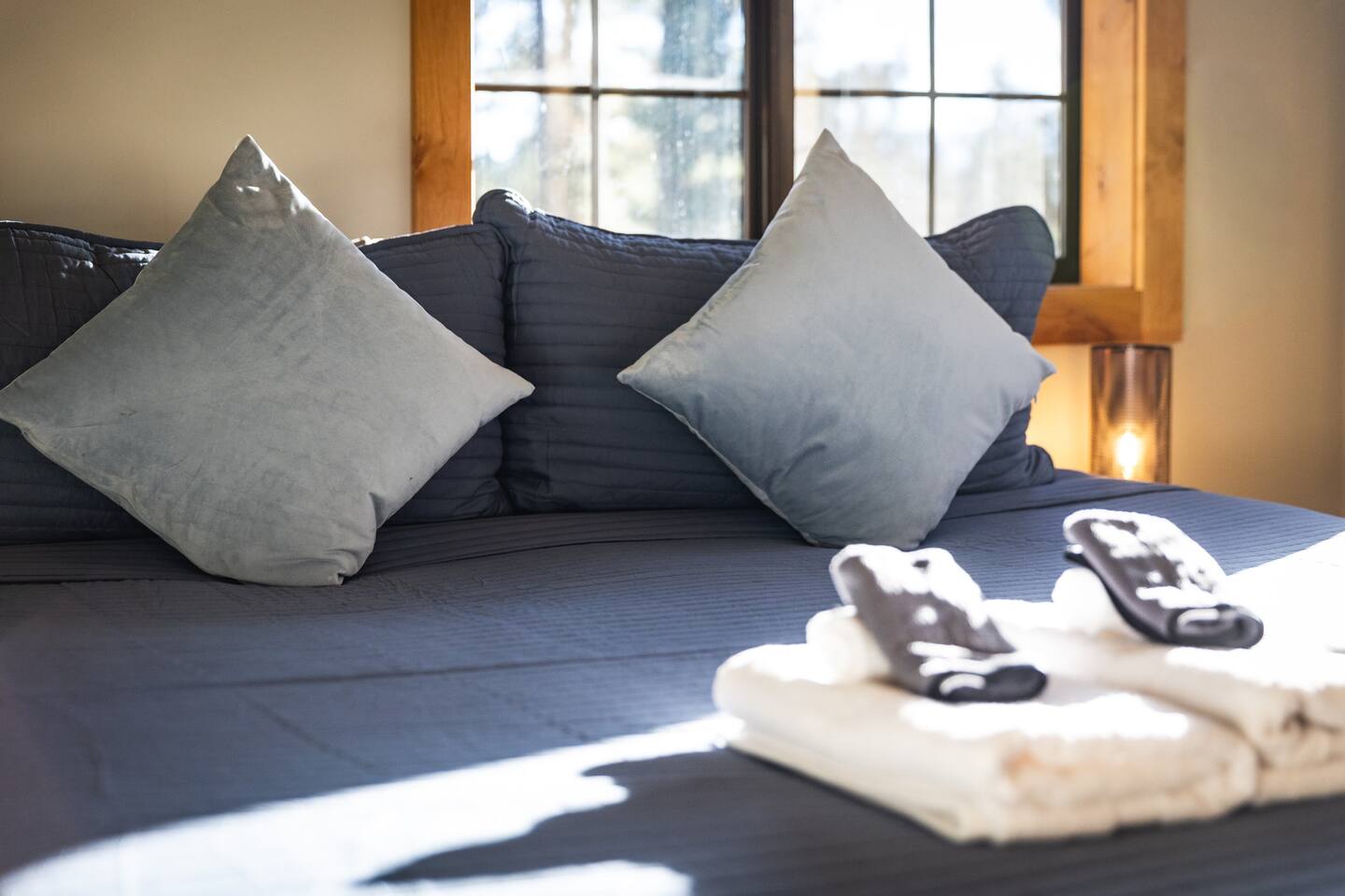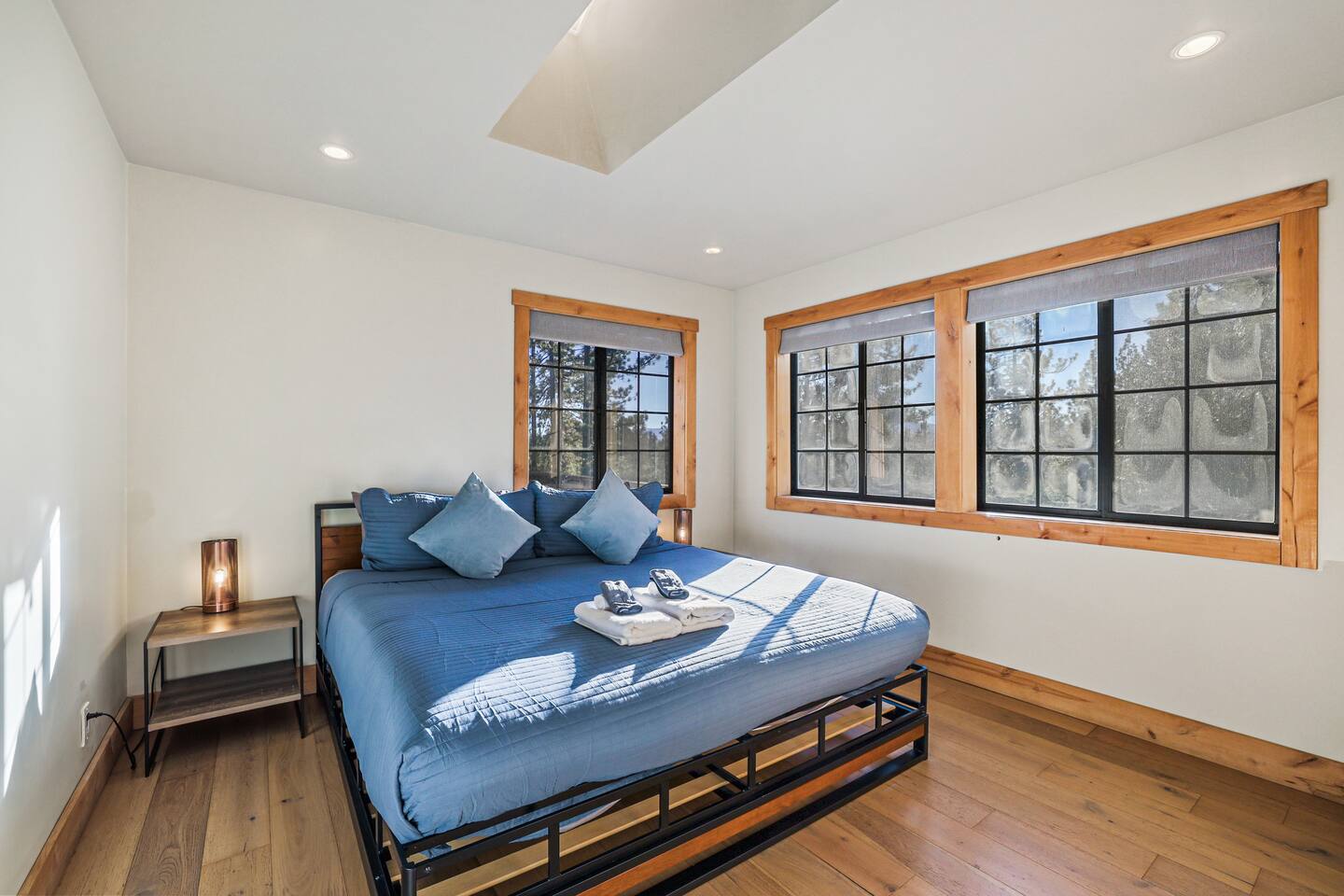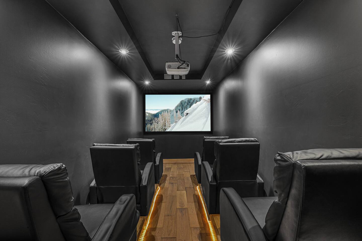 This five-bed, seven-bath, 2,735 sq ft home is designed for large groups and families (up to 18 guests). Bedroom 1: King Bed Bedroom 2: King Bed Bedroom 3: King Bed Bedroom 4: 2 Full Beds + 3 Twin Beds (2 bunks) Bedroom 5: 6 Twin Beds (3 bunks) The open-concept living area features a stone fireplace and large windows overlooking the trees. Gather around the chef’s kitchen island or step onto the spacious deck for BBQs and sunsets. The enclosed movie theater has seven recliners, a projector, and a popcorn machine — a true cinema experience at home.