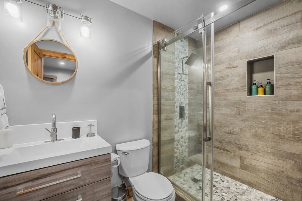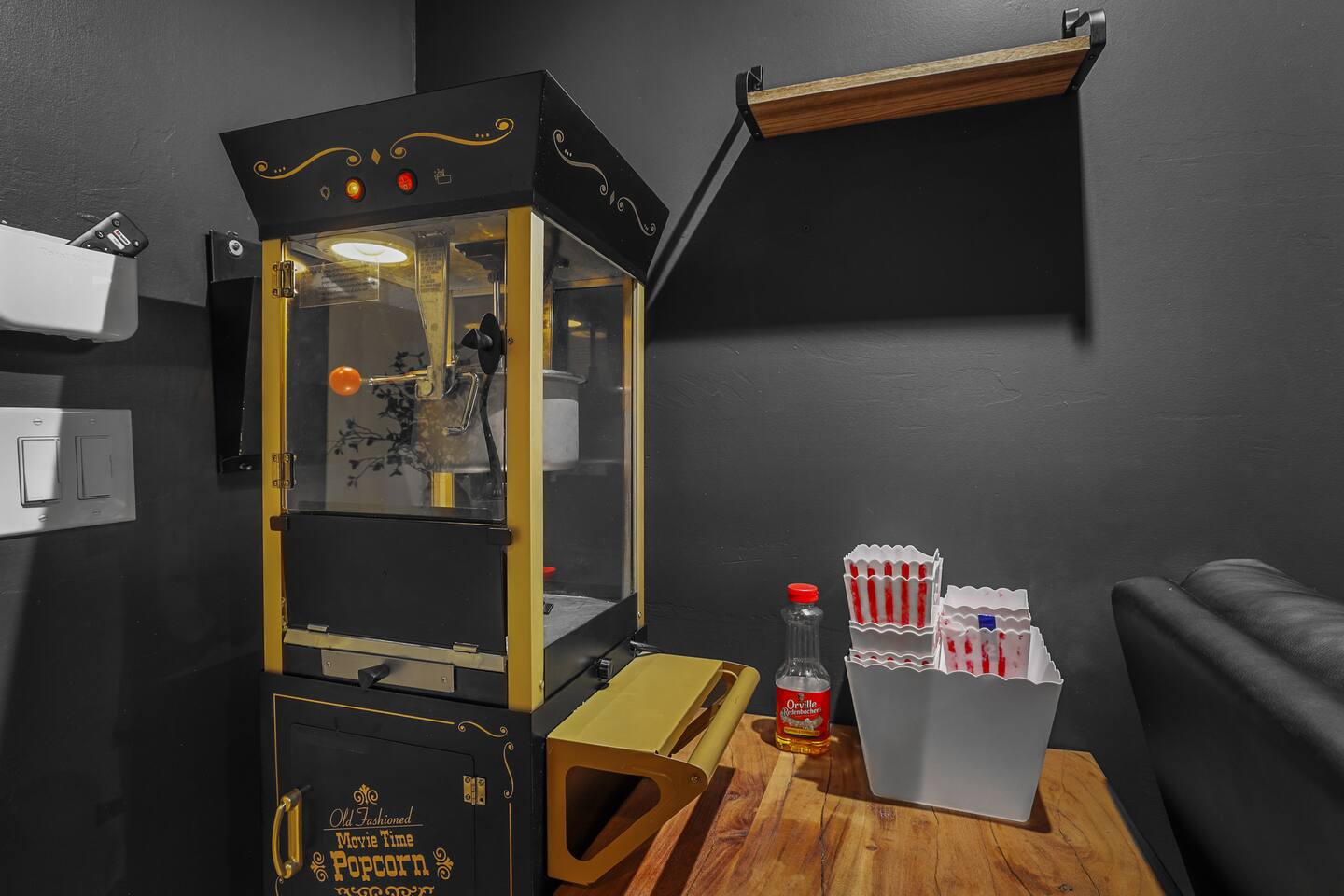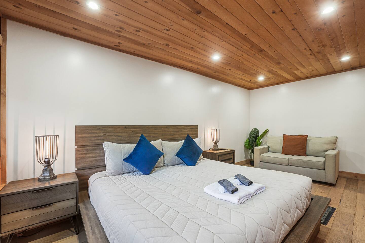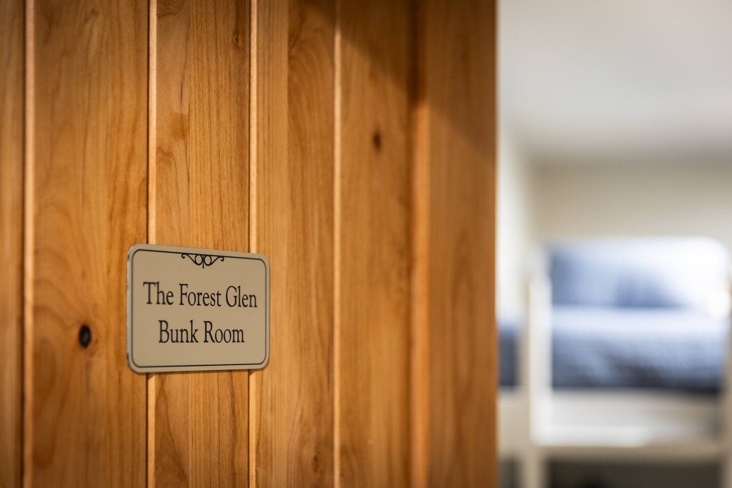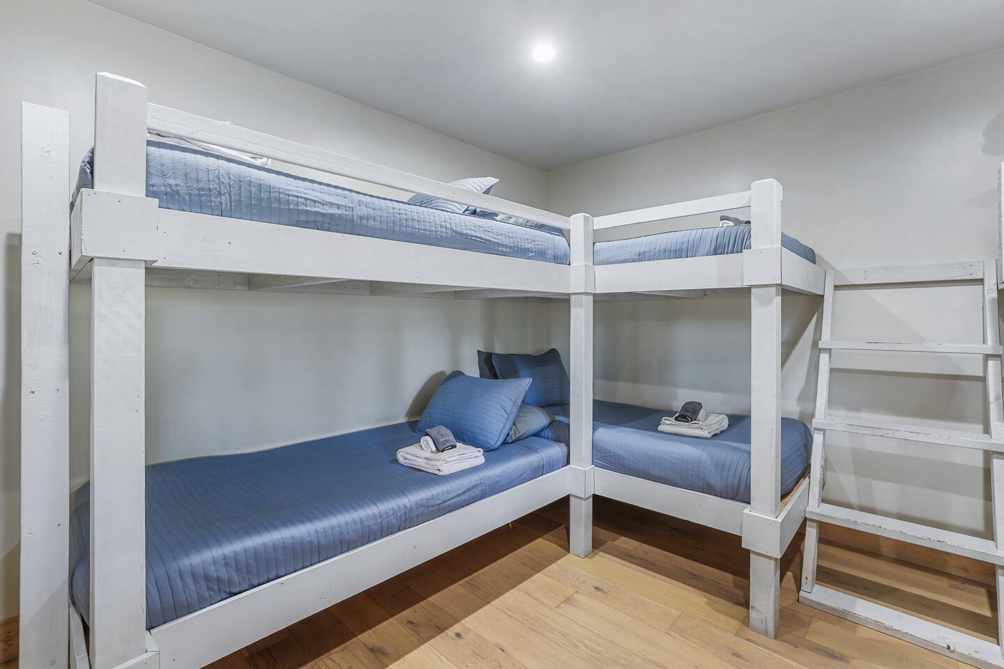 This five-bed, seven-bath, 2,735 sq ft home is designed for large groups and families (up to 18 guests). Bedroom 1: King Bed Bedroom 2: King Bed Bedroom 3: King Bed Bedroom 4: 2 Full Beds + 3 Twin Beds (2 bunks) Bedroom 5: 6 Twin Beds (3 bunks) The open-concept living area features a stone fireplace and large windows overlooking the trees. Gather around the chef’s kitchen island or step onto the spacious deck for BBQs and sunsets. The enclosed movie theater has seven recliners, a projector, and a popcorn machine — a true cinema experience at home.
