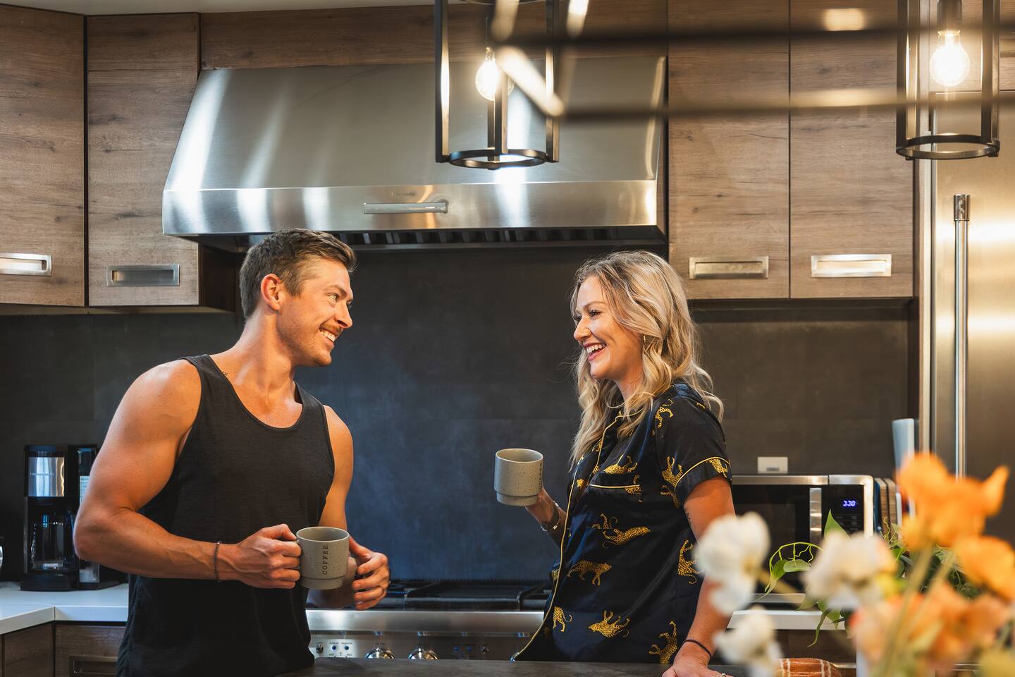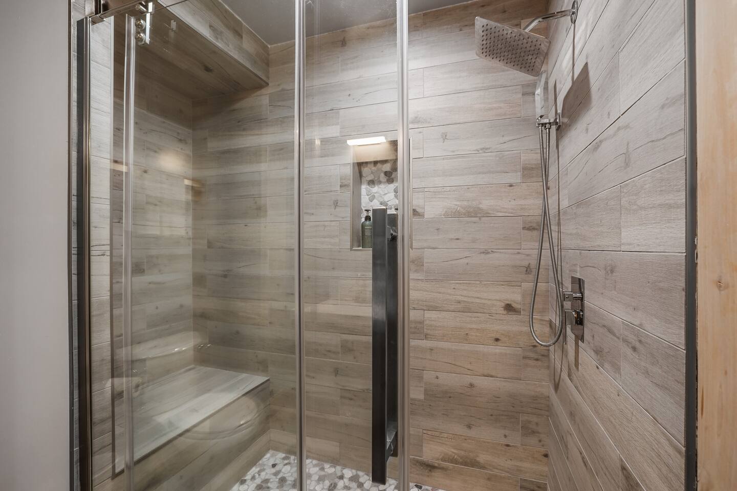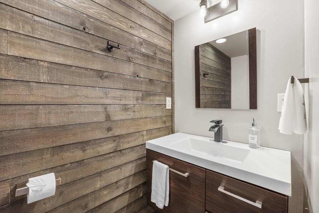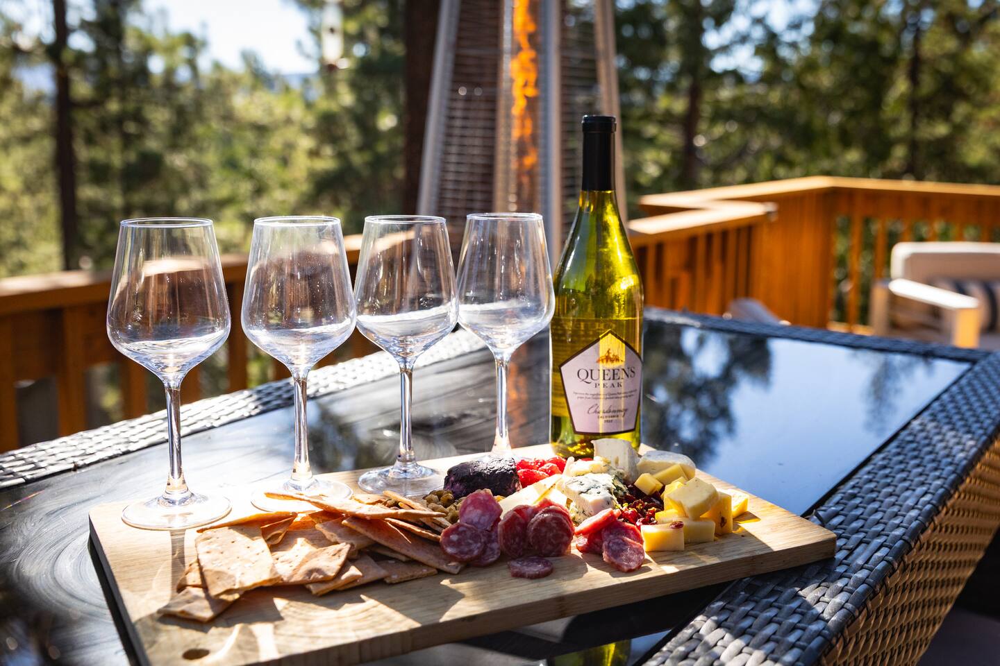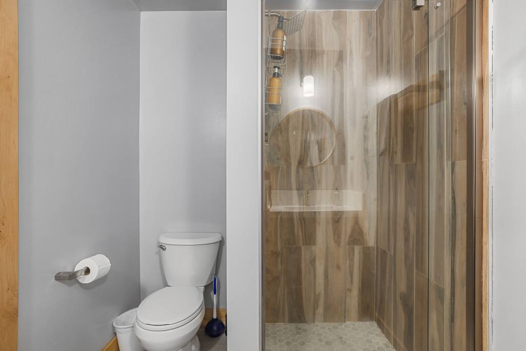 This five-bed, seven-bath, 2,735 sq ft home is designed for large groups and families (up to 18 guests). Bedroom 1: King Bed Bedroom 2: King Bed Bedroom 3: King Bed Bedroom 4: 2 Full Beds + 3 Twin Beds (2 bunks) Bedroom 5: 6 Twin Beds (3 bunks) The open-concept living area features a stone fireplace and large windows overlooking the trees. Gather around the chef’s kitchen island or step onto the spacious deck for BBQs and sunsets. The enclosed movie theater has seven recliners, a projector, and a popcorn machine — a true cinema experience at home.